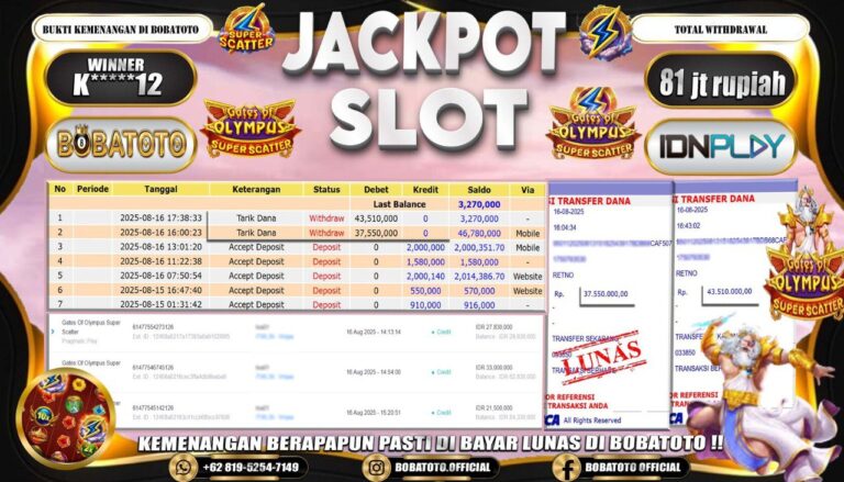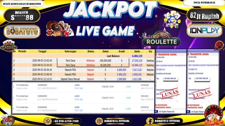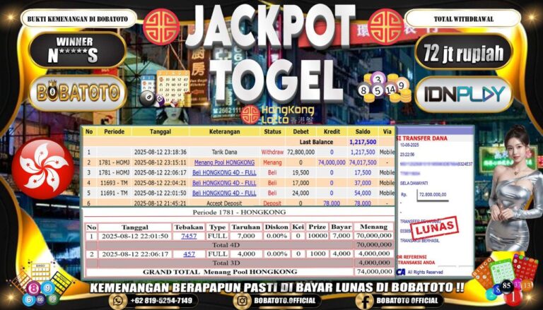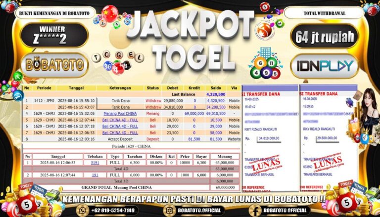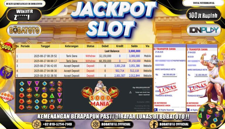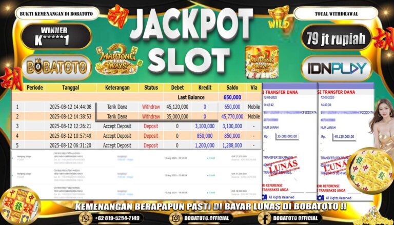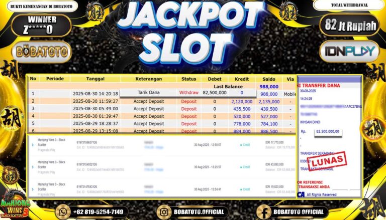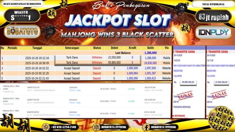 BOBATOTO – Selamat kepada User id :Z*****0 Telah berhasil mendapatkan kemenangan besar pada permainan SLOT MAHJONG WINS-3 BLACK SCATTER Dengan kemenangan Sebesar Rp.82,000,000-. Setelah mengisi formulir withdraw dengan kurung waktu hanya 5 – 10 menit pihak bobatoto sudah melakukan transfer kepada pemilik Userid dan dana sudah dapat di cairkan oleh pemenang. Bukti pembayaran yang kami berikan merupakan bukti pembayaran yang SAH /…