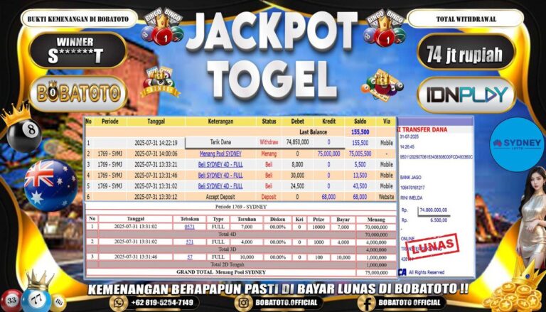 BOBATOTO JACKPOT TOGEL SYDNEY LOTTO Rp.74,000,000,- LUNAS!!