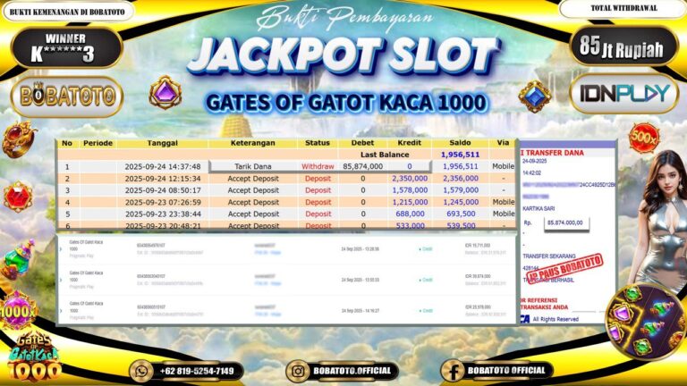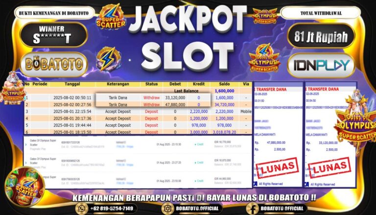 BOBATOTO – Selamat kepada User id : W****R Telah berhasil mendapatkan kemenangan besar pada permainan SLOT PRAGMATIC GATES OF OLYMPUS 1000 Dengan kemenangan Sebesar Rp.85,000,000,-. Setelah mengisi formulir withdraw dengan kurung waktu hanya 5 – 10 menit pihak bobatoto sudah melakukan transfer kepada pemilik Userid dan dana sudah dapat di cairkan oleh pemenang. Bukti pembayaran yang kami berikan merupakan bukti pembayaran…