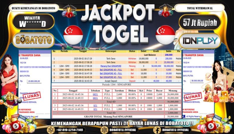 BOBATOTO – Selamat kepada User id : W******D Telah berhasil mendapatkan kemenangan besar pada permainan TOGEL SINGAPORE Dengan kemenangan Sebesar Rp.57,000,000,-. Setelah mengisi formulir withdraw dengan kurung waktu hanya 5 – 10 menit pihak bobatoto sudah melakukan transfer kepada pemilik Userid dan dana sudah dapat di cairkan oleh pemenang. Bukti pembayaran yang kami berikan merupakan bukti pembayaran yang SAH / VALID yang langung…