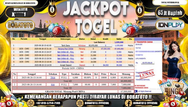 BOBATOTO JACKPOT TOGEL CHINA Rp.65,000,000,- LUNAS!!