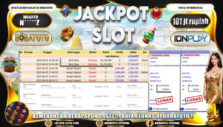 BOBATOTO – Selamat kepada User id : N*****Z Telah berhasil mendapatkan kemenangan besar pada permainan SLOT GATES OF GATOT KACA Dengan kemenangan Sebesar Rp.101,000,000,-. Setelah mengisi formulir withdraw dengan kurung waktu hanya 5 – 10 menit pihak bobatoto sudah melakukan transfer kepada pemilik Userid dan dana sudah dapat di cairkan oleh pemenang. Bukti pembayaran yang kami berikan merupakan bukti pembayaran yang SAH…