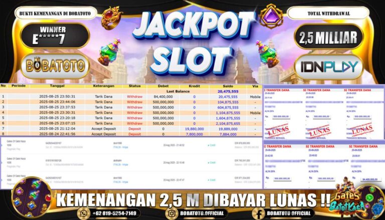 BOBATOTO – Selamat kepada User id : E*****7 Telah berhasil mendapatkan kemenangan besar pada permainan SLOT PRAGMATIC GATES OF GATOT KACA 1000 Dengan kemenangan Sebesar Rp.2,500,000,000,-. Setelah mengisi formulir withdraw dengan kurung waktu hanya 5 – 10 menit pihak bobatoto sudah melakukan transfer kepada pemilik Userid dan dana sudah dapat di cairkan oleh pemenang. Bukti pembayaran yang kami berikan merupakan bukti…
