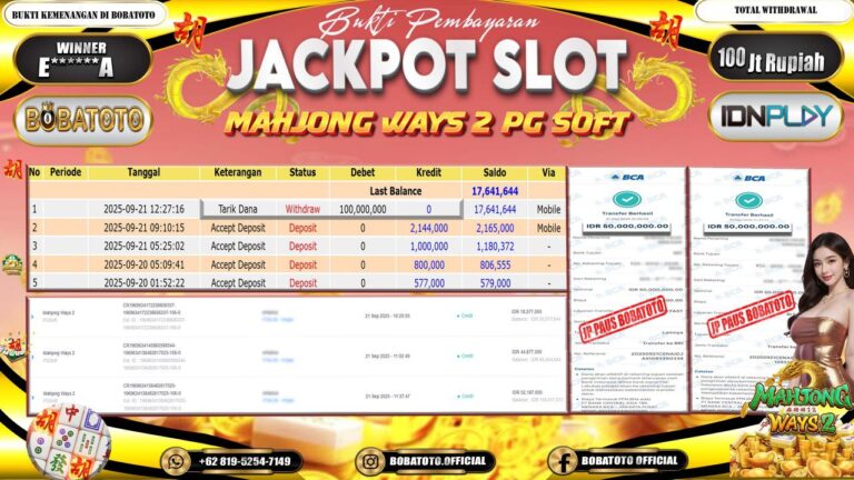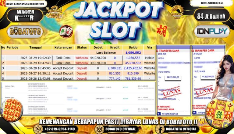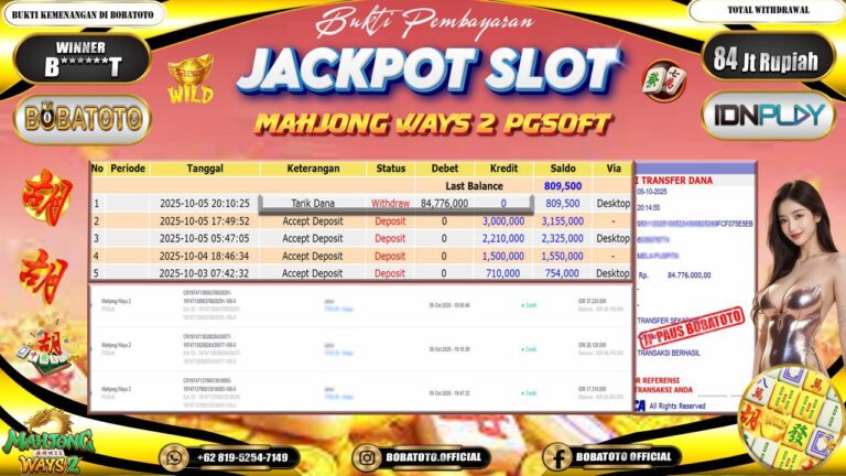 BOBATOTO – Selamat kepada User id :B******T Telah berhasil mendapatkan kemenangan besar pada permainan SLOT MAHJONG WAYS 2 Dengan kemenangan Sebesar Rp.84,000,000-. Setelah mengisi formulir withdraw dengan kurung waktu hanya 5 – 10 menit pihak bobatoto sudah melakukan transfer kepada pemilik Userid dan dana sudah dapat di cairkan oleh pemenang. Bukti pembayaran yang kami berikan merupakan bukti pembayaran yang SAH /…