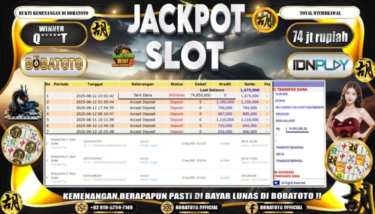 BOBATOTO – Selamat kepada User id :Q*****T Telah berhasil mendapatkan kemenangan besar pada permainan SLOT MAHJONG WINS-3 BLACK SCATTER Dengan kemenangan Sebesar Rp.74,000,000-. Setelah mengisi formulir withdraw dengan kurung waktu hanya 5 – 10 menit pihak bobatoto sudah melakukan transfer kepada pemilik Userid dan dana sudah dapat di cairkan oleh pemenang. Bukti pembayaran yang kami berikan merupakan bukti pembayaran yang SAH /…