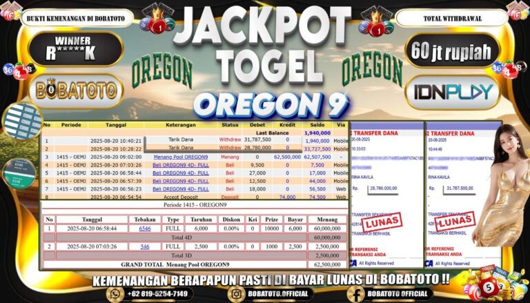 BOBATOTO JACKPOT TOGEL OREGON 9 Rp.60,000,000,- LUNAS!!