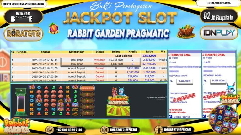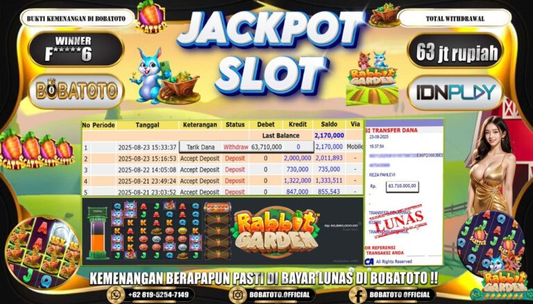 BOBATOTO – Selamat kepada User id : F*****6 Telah berhasil mendapatkan kemenangan besar pada permainan SLOT PRAGMATIC RABBIT GARDEN Dengan kemenangan Sebesar Rp.63,000,000,-. Setelah mengisi formulir withdraw dengan kurung waktu hanya 5 – 10 menit pihak bobatoto sudah melakukan transfer kepada pemilik Userid dan dana sudah dapat di cairkan oleh pemenang. Bukti pembayaran yang kami berikan merupakan bukti pembayaran yang SAH /…