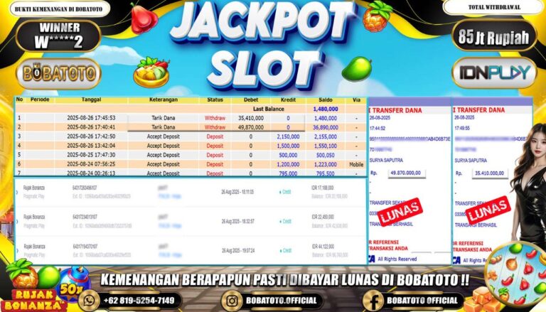 BOBATOTO – Selamat kepada User id : W*****2 Telah berhasil mendapatkan kemenangan besar pada permainan SLOT PRAGMATIC RUJAK BONANZA Dengan kemenangan Sebesar Rp.85,000,000,-. Setelah mengisi formulir withdraw dengan kurung waktu hanya 5 – 10 menit pihak bobatoto sudah melakukan transfer kepada pemilik Userid dan dana sudah dapat di cairkan oleh pemenang. Bukti pembayaran yang kami berikan merupakan bukti pembayaran yang SAH /…