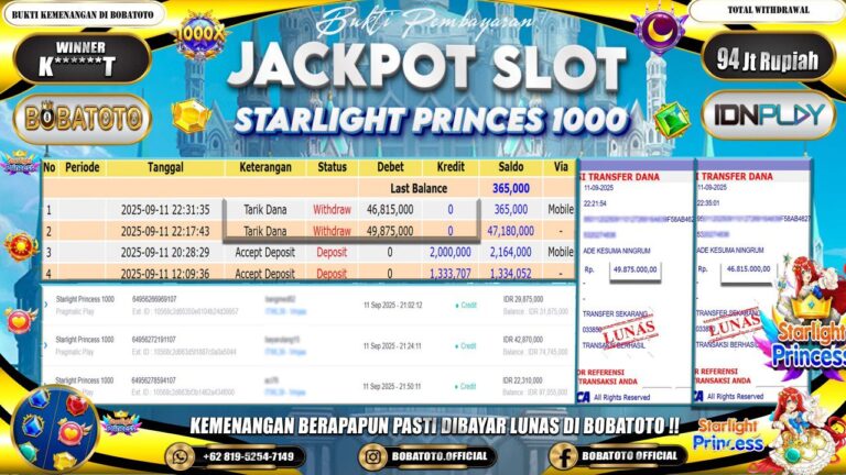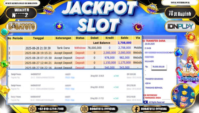 BOBATOTO – Selamat kepada User id : N*****2 Telah berhasil mendapatkan kemenangan besar pada permainan SLOT PRAGMATIC STARLIGHT PRINCESS Dengan kemenangan Sebesar Rp.78,000,000,-. Setelah mengisi formulir withdraw dengan kurung waktu hanya 5 – 10 menit pihak bobatoto sudah melakukan transfer kepada pemilik Userid dan dana sudah dapat di cairkan oleh pemenang. Bukti pembayaran yang kami berikan merupakan bukti pembayaran yang SAH /…
