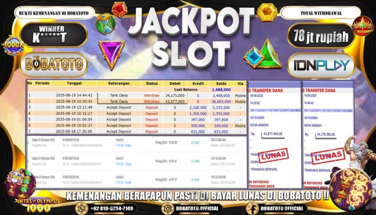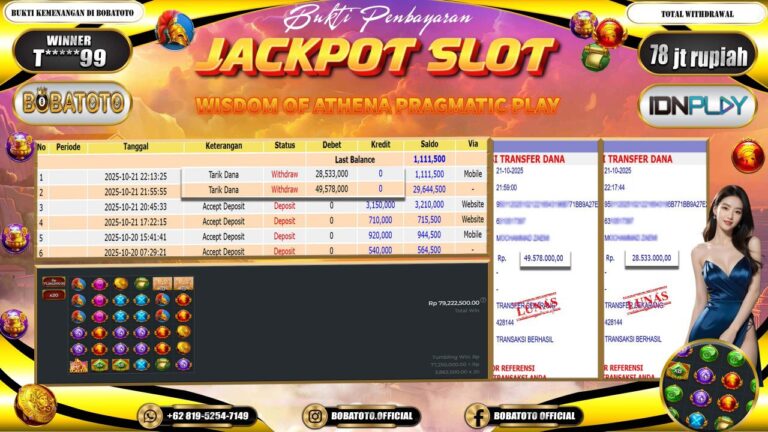 BOBATOTO – Selamat kepada User id : T*****99 Telah berhasil mendapatkan kemenangan besar pada permainan SLOT WISDOM OF ATHENA Dengan kemenangan Sebesar Rp.78,000,000,-. Setelah mengisi formulir withdraw dengan kurung waktu hanya 5 – 10 menit pihak bobatoto sudah melakukan transfer kepada pemilik Userid dan dana sudah dapat di cairkan oleh pemenang. Bukti pembayaran yang kami berikan merupakan bukti pembayaran yang SAH /…