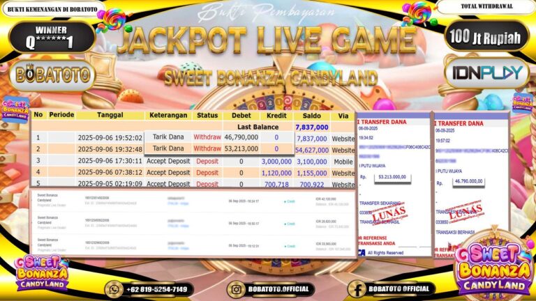 BOBATOTO – Selamat kepada User id : Q******1 Telah berhasil mendapatkan kemenangan besar pada permainan LIVE GAME SWEET BONANZA CANDY LAND Dengan kemenangan Sebesar Rp.100,000,000,-. Setelah mengisi formulir withdraw dengan kurung waktu hanya 5 – 10 menit pihak bobatoto sudah melakukan transfer kepada pemilik Userid dan dana sudah dapat di cairkan oleh pemenang. Bukti pembayaran yang kami berikan merupakan bukti pembayaran yang SAH…