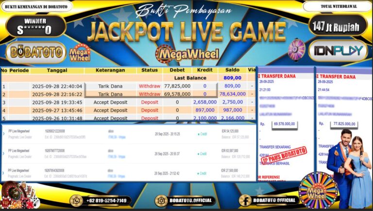 BOBATOTO – Selamat kepada User id : S******O Telah berhasil mendapatkan kemenangan besar pada permainan LIVE GAME MEGAWHEEL Dengan kemenangan Sebesar Rp.147,000,000,-. Setelah mengisi formulir withdraw dengan kurung waktu hanya 5 – 10 menit pihak bobatoto sudah melakukan transfer kepada pemilik Userid dan dana sudah dapat di cairkan oleh pemenang. Bukti pembayaran yang kami berikan merupakan bukti pembayaran yang SAH /…