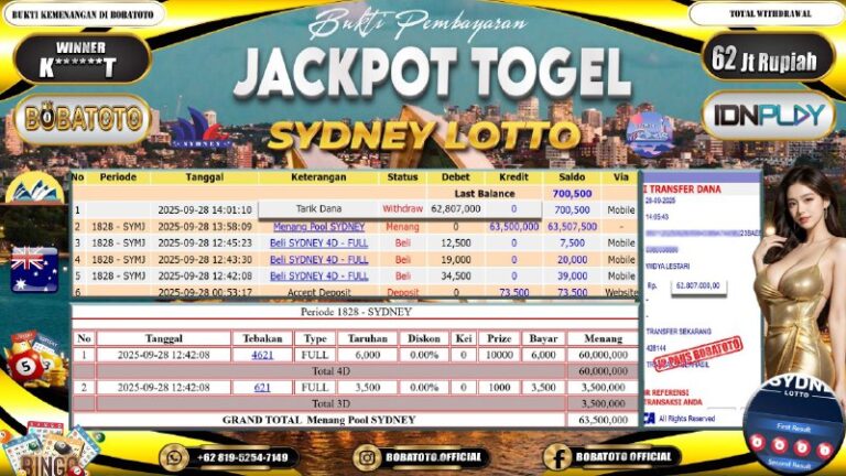 BOBATOTO JACKPOT TOGEL SYDNEY LOTTO Rp.62,000,000,- LUNAS!!
