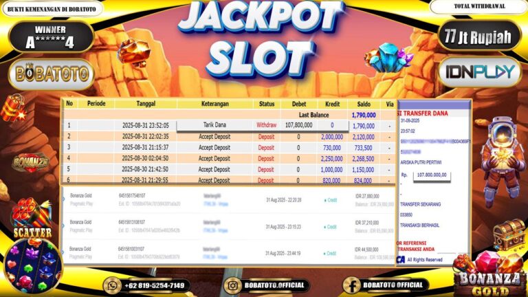 BOBATOTO – Selamat kepada User id : A******4 Telah berhasil mendapatkan kemenangan besar pada permainan SLOT PRAGMATIC BONANZA GOLD Dengan kemenangan Sebesar Rp.77,000,000,-. Setelah mengisi formulir withdraw dengan kurung waktu hanya 5 – 10 menit pihak bobatoto sudah melakukan transfer kepada pemilik Userid dan dana sudah dapat di cairkan oleh pemenang. Bukti pembayaran yang kami berikan merupakan bukti pembayaran yang SAH /…