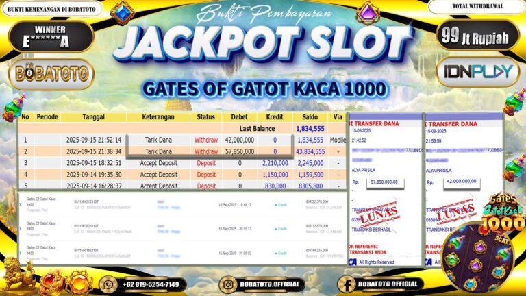 BOBATOTO – Selamat kepada User id : E******A Telah berhasil mendapatkan kemenangan besar pada permainan SLOT PRAGMATIC GATES OF GATOT KACA 1000 Dengan kemenangan Sebesar Rp.99,000,000,-. Setelah mengisi formulir withdraw dengan kurung waktu hanya 5 – 10 menit pihak bobatoto sudah melakukan transfer kepada pemilik Userid dan dana sudah dapat di cairkan oleh pemenang. Bukti pembayaran yang kami berikan merupakan bukti…