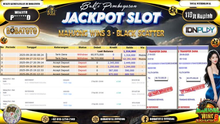 BOBATOTO – Selamat kepada User id :P*****D Telah berhasil mendapatkan kemenangan besar pada permainan SLOT MAHJONG WINS-3 BLACK SCATTER Dengan kemenangan Sebesar Rp.119,000,000-. Setelah mengisi formulir withdraw dengan kurung waktu hanya 5 – 10 menit pihak bobatoto sudah melakukan transfer kepada pemilik Userid dan dana sudah dapat di cairkan oleh pemenang. Bukti pembayaran yang kami berikan merupakan bukti pembayaran yang SAH /…
