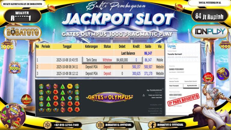 BOBATOTO JACKPOT SLOT PRAGMATIC GATES OF OLYMPUS 1000 Rp.85,000,000,- LUNAS!!