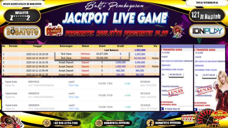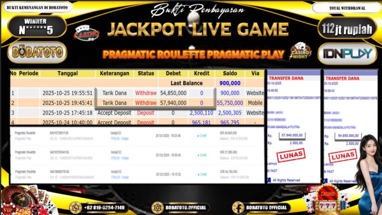 BOBATOTO – Selamat kepada User id : N******5 Telah berhasil mendapatkan kemenangan besar pada permainan JACKPOT LIVE GAME PRAGMATIC ROULETTE Dengan kemenangan Sebesar Rp.112,000,000,-. Setelah mengisi formulir withdraw dengan kurung waktu hanya 5 – 10 menit pihak bobatoto sudah melakukan transfer kepada pemilik Userid dan dana sudah dapat di cairkan oleh pemenang. Bukti pembayaran yang kami berikan merupakan bukti pembayaran yang SAH…