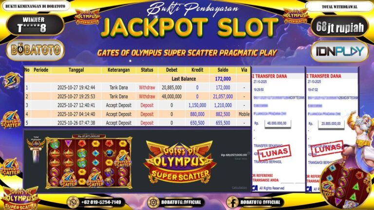 BOBATOTO – Selamat kepada User id : T*****8 Telah berhasil mendapatkan kemenangan besar pada permainan SLOT PRAGMATIC GATES OF OLYMPUS SUPER SCATTER Dengan kemenangan Sebesar Rp.68,000,000,-. Setelah mengisi formulir withdraw dengan kurung waktu hanya 5 – 10 menit pihak bobatoto sudah melakukan transfer kepada pemilik Userid dan dana sudah dapat di cairkan oleh pemenang. Bukti pembayaran yang kami berikan merupakan bukti…