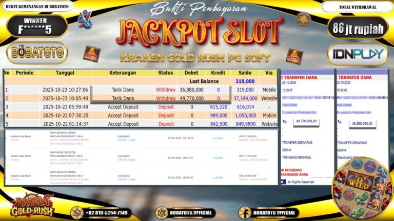 BOBATOTO – Selamat kepada User id :F******5 Telah berhasil mendapatkan kemenangan besar pada permainan SLOT KRAKEN GOLD RUSH 2 Dengan kemenangan Sebesar Rp.86,000,000-. Setelah mengisi formulir withdraw dengan kurung waktu hanya 5 – 10 menit pihak bobatoto sudah melakukan transfer kepada pemilik Userid dan dana sudah dapat di cairkan oleh pemenang. Bukti pembayaran yang kami berikan merupakan bukti pembayaran yang SAH…