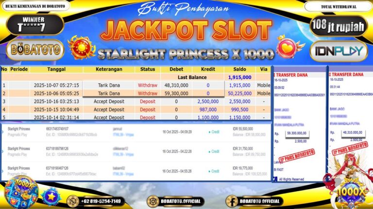 BOBATOTO – Selamat kepada User id : T*****7 Telah berhasil mendapatkan kemenangan besar pada permainan SLOT STARLIGHT PRINCES 1000 Dengan kemenangan Sebesar Rp.108,000,000,-. Setelah mengisi formulir withdraw dengan kurung waktu hanya 5 – 10 menit pihak bobatoto sudah melakukan transfer kepada pemilik Userid dan dana sudah dapat di cairkan oleh pemenang. Bukti pembayaran yang kami berikan merupakan bukti pembayaran yang SAH /…