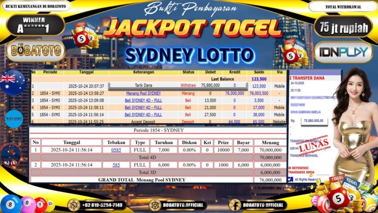 BOBATOTO JACKPOT TOGEL SYDNEY LOTTO Rp.75,000,000,- LUNAS!!