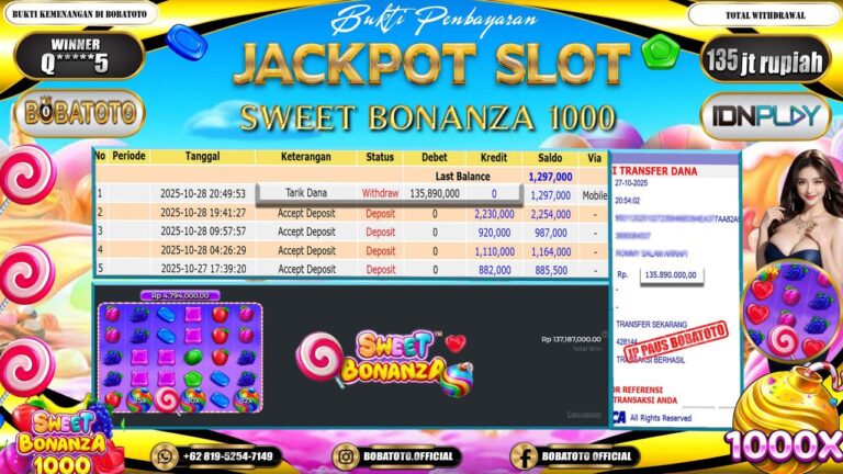 BOBATOTO – Selamat kepada User id : Q*****5 Telah berhasil mendapatkan kemenangan besar pada permainan SLOT SWEET BONANZA 1000 Dengan kemenangan Sebesar Rp.135,000,000,-. Setelah mengisi formulir withdraw dengan kurung waktu hanya 5 – 10 menit pihak bobatoto sudah melakukan transfer kepada pemilik Userid dan dana sudah dapat di cairkan oleh pemenang. Bukti pembayaran yang kami berikan merupakan bukti pembayaran yang SAH…