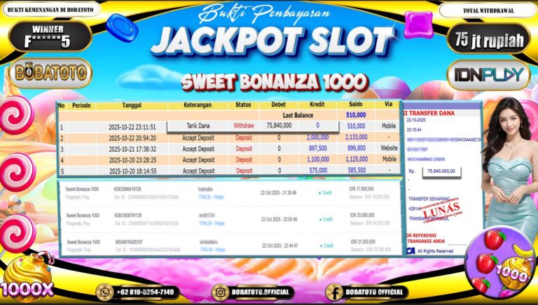 BOBATOTO – Selamat kepada User id : F******5 Telah berhasil mendapatkan kemenangan besar pada permainan SLOT SWEET BONANZA 1000 Dengan kemenangan Sebesar Rp.75,000,000,-. Setelah mengisi formulir withdraw dengan kurung waktu hanya 5 – 10 menit pihak bobatoto sudah melakukan transfer kepada pemilik Userid dan dana sudah dapat di cairkan oleh pemenang. Bukti pembayaran yang kami berikan merupakan bukti pembayaran yang SAH…