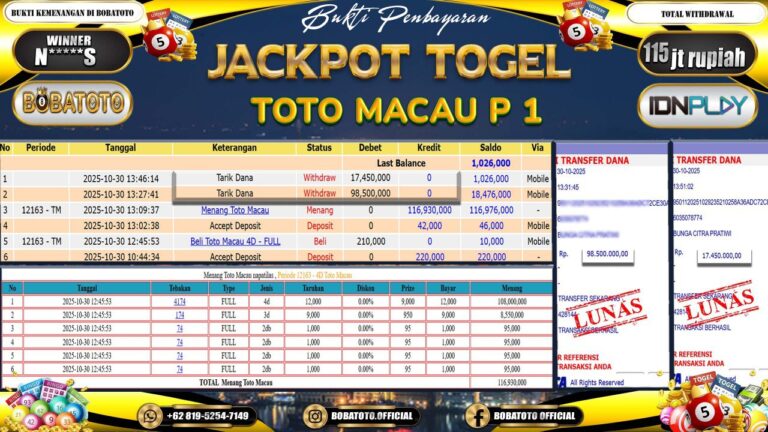 BOBATOTO JACKPOT TOGEL TOTO MACAU P 1 Rp.115,000,000,- LUNAS!!