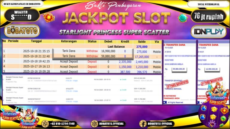 BOBATOTO – Selamat kepada User id : S*****D Telah berhasil mendapatkan kemenangan besar pada permainan SLOT STARLIGHT PRINCES SUPER SCATTER Dengan kemenangan Sebesar Rp.76,000,000,-. Setelah mengisi formulir withdraw dengan kurung waktu hanya 5 – 10 menit pihak bobatoto sudah melakukan transfer kepada pemilik Userid dan dana sudah dapat di cairkan oleh pemenang. Bukti pembayaran yang kami berikan merupakan bukti pembayaran yang SAH…