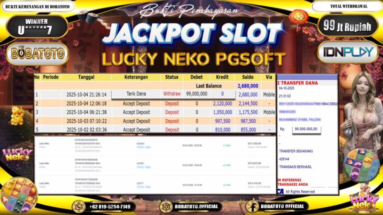 BOBATOTO – Selamat kepada User id :U******7 Telah berhasil mendapatkan kemenangan besar pada permainan SLOT LUCKY NEKO Dengan kemenangan Sebesar Rp.99,000,000-. Setelah mengisi formulir withdraw dengan kurung waktu hanya 5 – 10 menit pihak bobatoto sudah melakukan transfer kepada pemilik Userid dan dana sudah dapat di cairkan oleh pemenang. Bukti pembayaran yang kami berikan merupakan bukti pembayaran yang SAH / VALID yang…