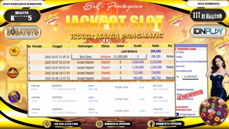 BOBATOTO – Selamat kepada User id : K*****5 Telah berhasil mendapatkan kemenangan besar pada permainan SLOT 15000X MANIA Dengan kemenangan Sebesar Rp.111,000,000,-. Setelah mengisi formulir withdraw dengan kurung waktu hanya 5 – 10 menit pihak bobatoto sudah melakukan transfer kepada pemilik Userid dan dana sudah dapat di cairkan oleh pemenang. Bukti pembayaran yang kami berikan merupakan bukti pembayaran yang SAH / VALID yang…