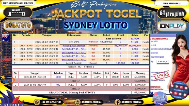 BOBATOTO JACKPOT TOGEL SYDNEY LOTTO Rp.64,000,000,- LUNAS!!