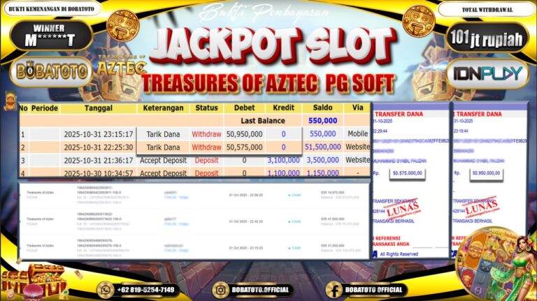 BOBATOTO – Selamat kepada User id : M*****T Telah berhasil mendapatkan kemenangan besar pada permainan SLOT TREASURES OF AZTEC Dengan kemenangan Sebesar Rp.101,000,000,-. Setelah mengisi formulir withdraw dengan kurung waktu hanya 5 – 10 menit pihak bobatoto sudah melakukan transfer kepada pemilik Userid dan dana sudah dapat di cairkan oleh pemenang. Bukti pembayaran yang kami berikan merupakan bukti pembayaran yang SAH…