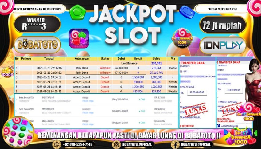 BOBATOTO – Selamat kepada User id : R*****3 Telah berhasil mendapatkan kemenangan besar pada permainan  SLOT SWEET BONANZA 1000  Dengan kemenangan Sebesar Rp.72,000,000,-. Setelah mengisi formulir withdraw dengan kurung waktu hanya 5 – 10 menit pihak bobatoto sudah melakukan transfer kepada pemilik Userid dan dana sudah dapat di cairkan oleh pemenang. Bukti pembayaran yang kami berikan merupakan bukti pembayaran yang SAH / VALID yang langung di dapatkan melaui tanda transfer transaksi dari Bank yang di tuju.
