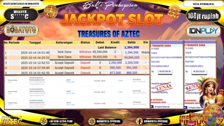 BOBATOTO JACKPOT SLOT TREASURES OF AZTEC Rp.108,000,000,- LUNAS!!