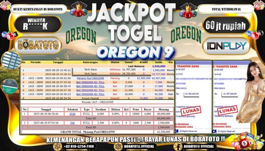 BOBATOTO – Selamat kepada User id : R*****K Telah berhasil mendapatkan kemenangan besar pada permainan TOGEL OREGON 9 Dengan kemenangan Sebesar Rp.60,000,000,-. Setelah mengisi formulir withdraw dengan kurung waktu hanya 5 – 10 menit pihak bobatoto sudah melakukan transfer kepada pemilik Userid dan dana sudah dapat di cairkan oleh pemenang. Bukti pembayaran yang kami berikan merupakan bukti pembayaran yang SAH / VALID yang langung di dapatkan melaui tanda transfer transaksi dari Bank yang di tuju.